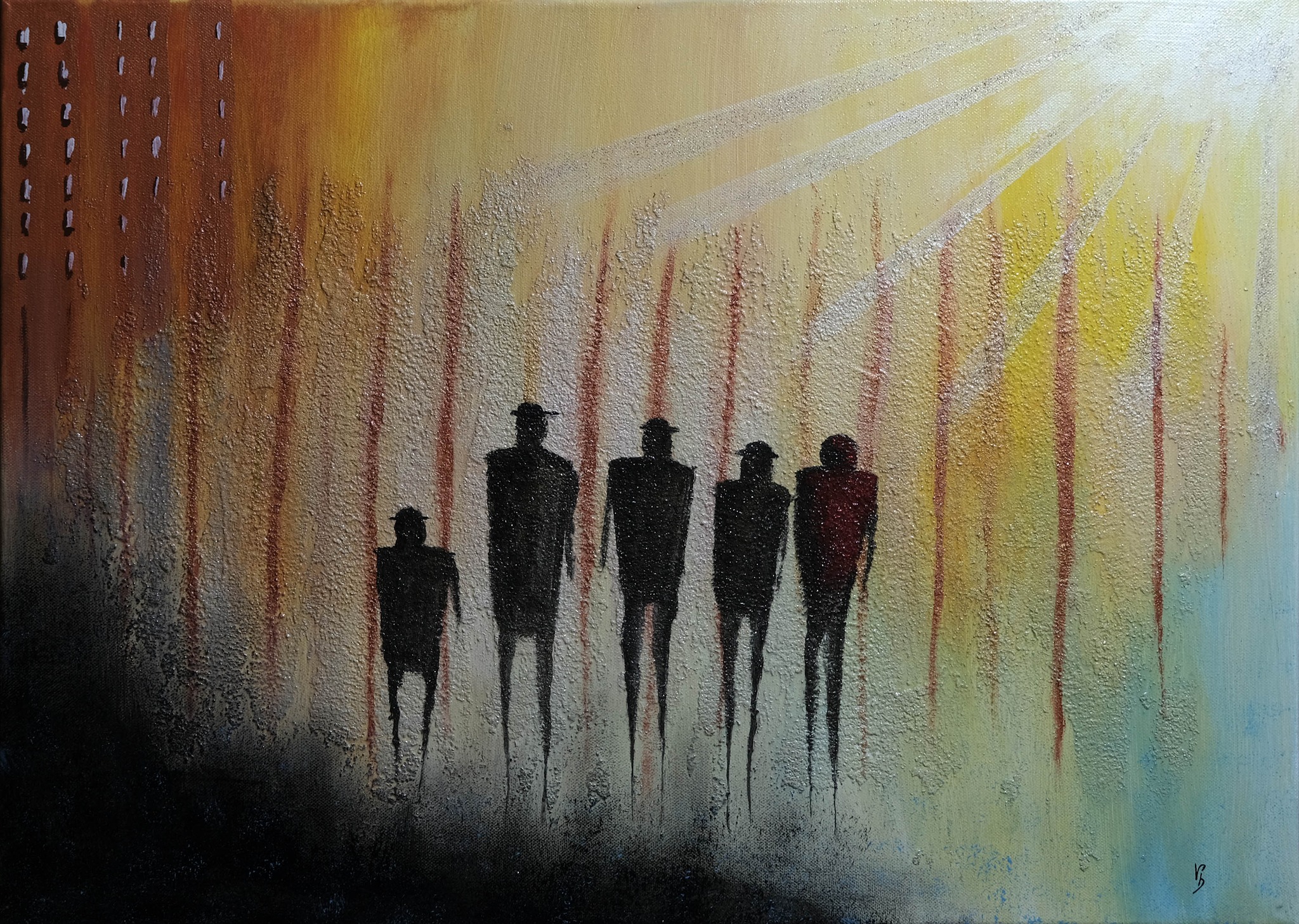 Le figure umane, filiformi e stilizzate, appaiono come presenze in perenne dialogo silenzioso, nel tentativo di allungarsi verso il cielo.
