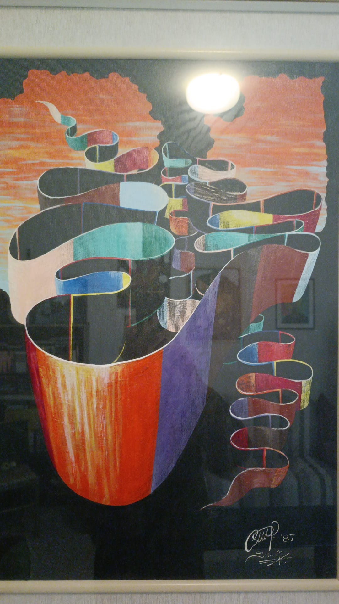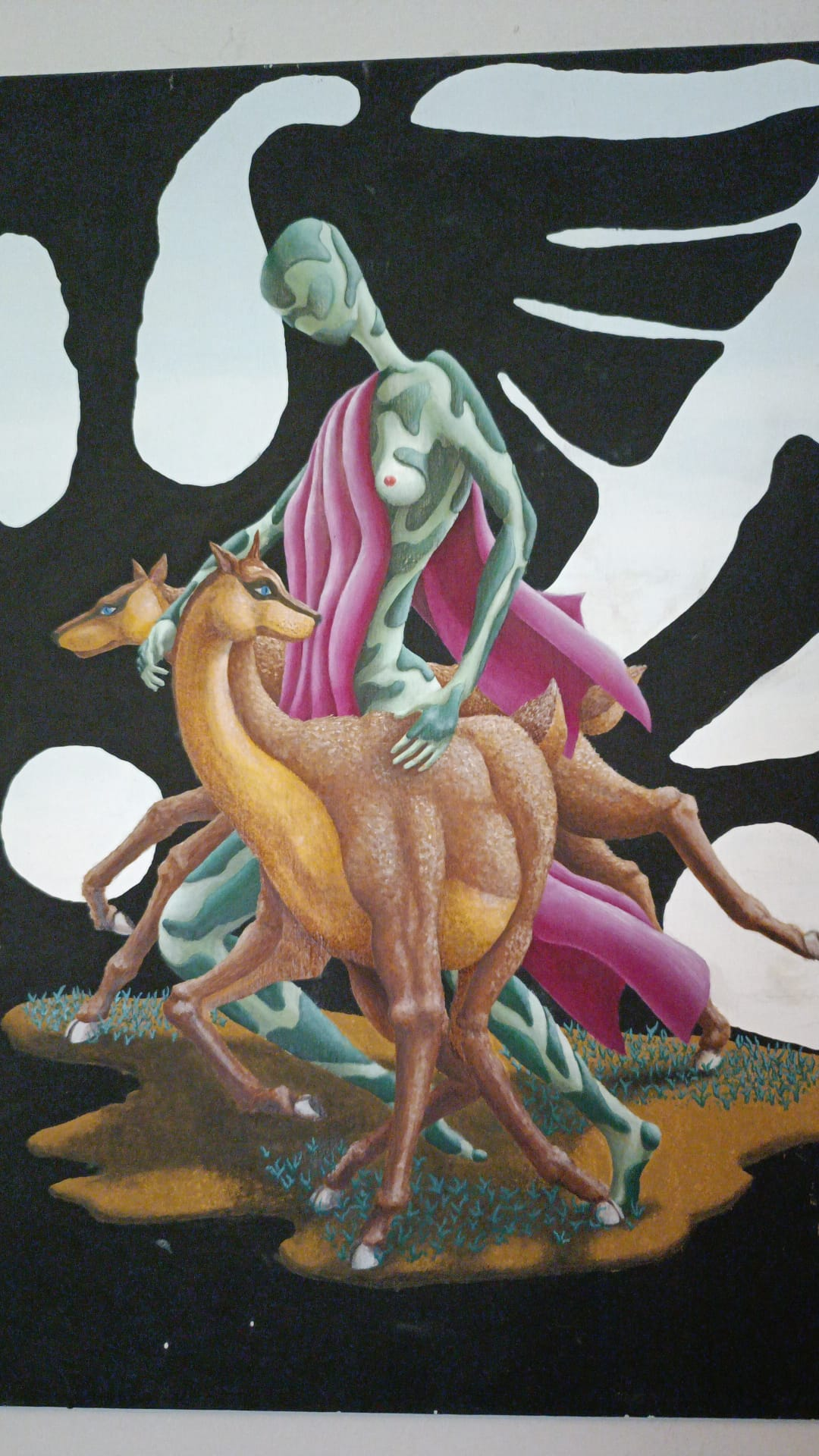 Nell’opera con la figura danzante, il nastro a bande arancioni è parte del movimento, un’energia cinetica che si materializza. In altre opere, il nastro narra l’intera composizione, un vortice cromatico che è viaggio, frammentazione e ricomposizione, una rappresentazione visiva del divenire, così come nella scena con l’animale fantastico, si trasforma in un drappo che nasconde e svela, un legame tra l’essere senziente e la natura primordiale, anch’essa trasfigurata in una visione multipla e dinamica.