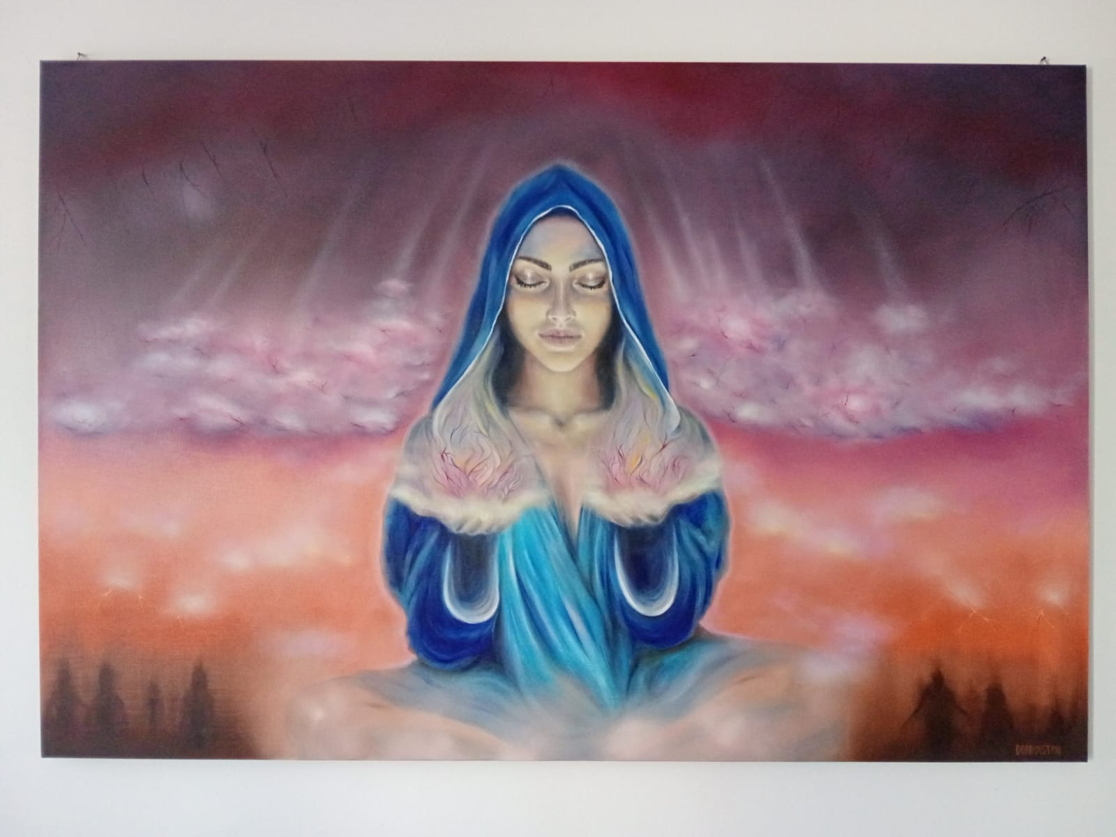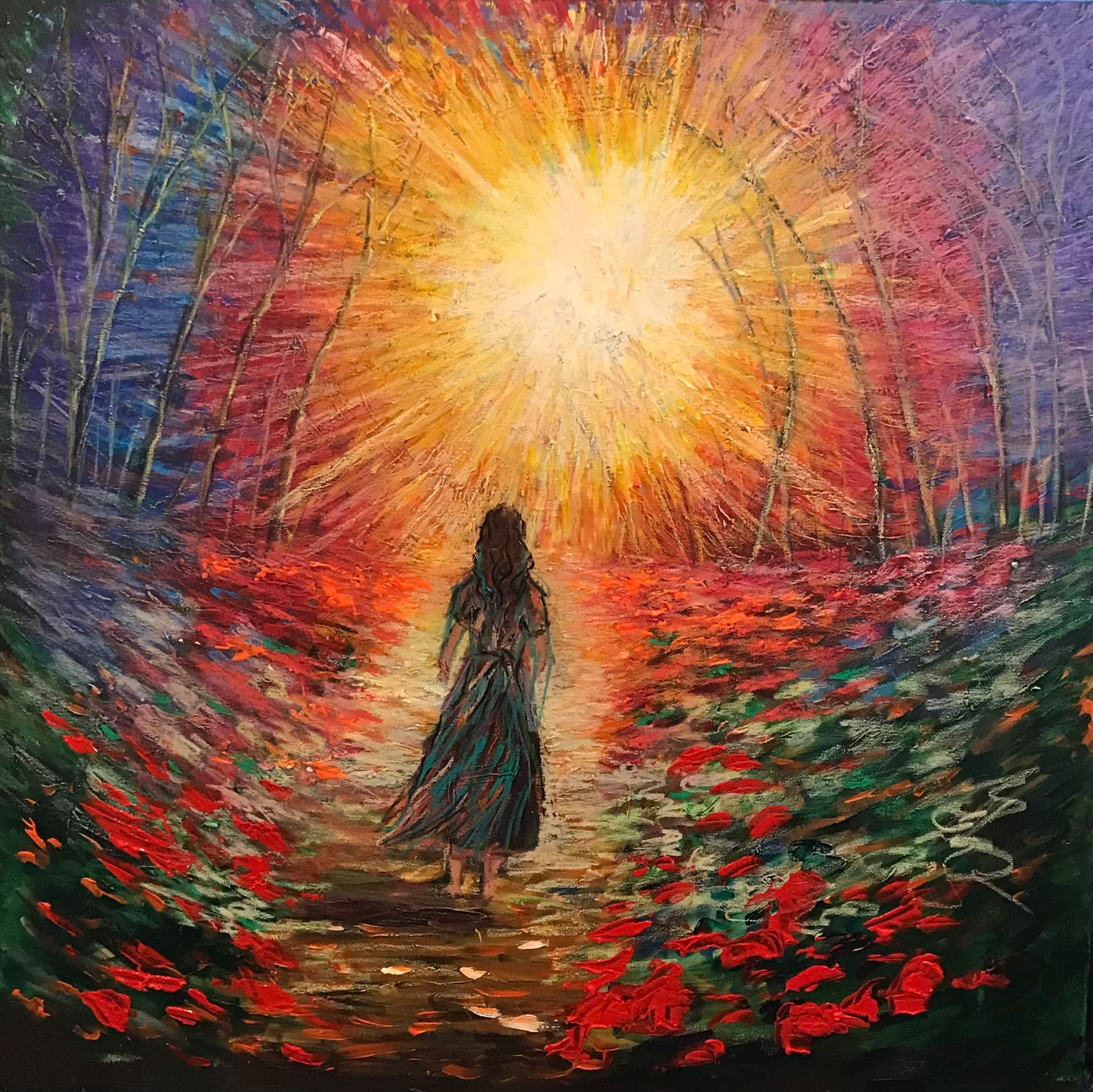 Che esploda dal petto di una figura femminile, come un sole interiore che irradia filamenti di vita cosmica, o che si manifesti come approdo luminoso al termine di un sentiero boschivo, la luce è sempre il nucleo incandescente attorno al quale si condensa il significato veicolato dall’artista.