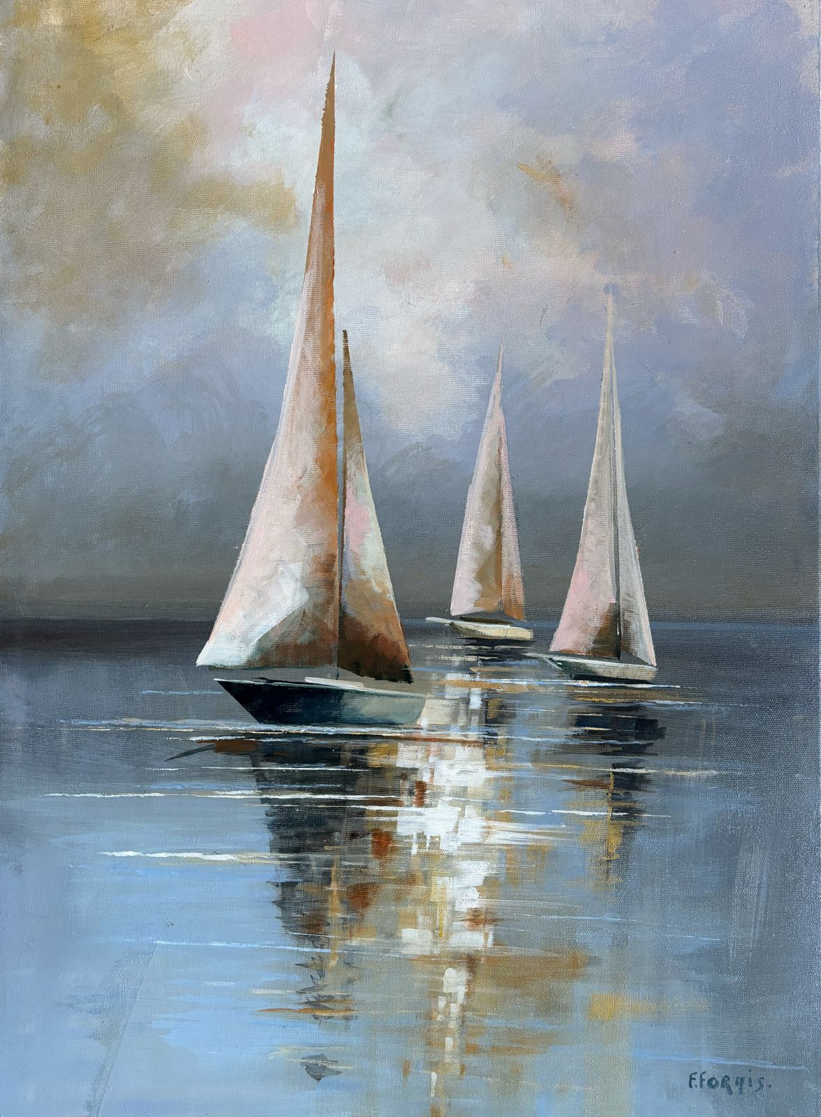Formis ci racconta la storia di un’umanità fragile, transitoria, posta di fronte all’immutabilità dell’orizzonte marino, dove il mare, nelle sue tele, è il grande Altro. È lo specchio dell’anima, talvolta calmo e riflettente come nelle marine con le vele spiegate, talvolta appena intuito, dietro il nervoso intreccio delle sterpaglie e dei fiori selvatici.