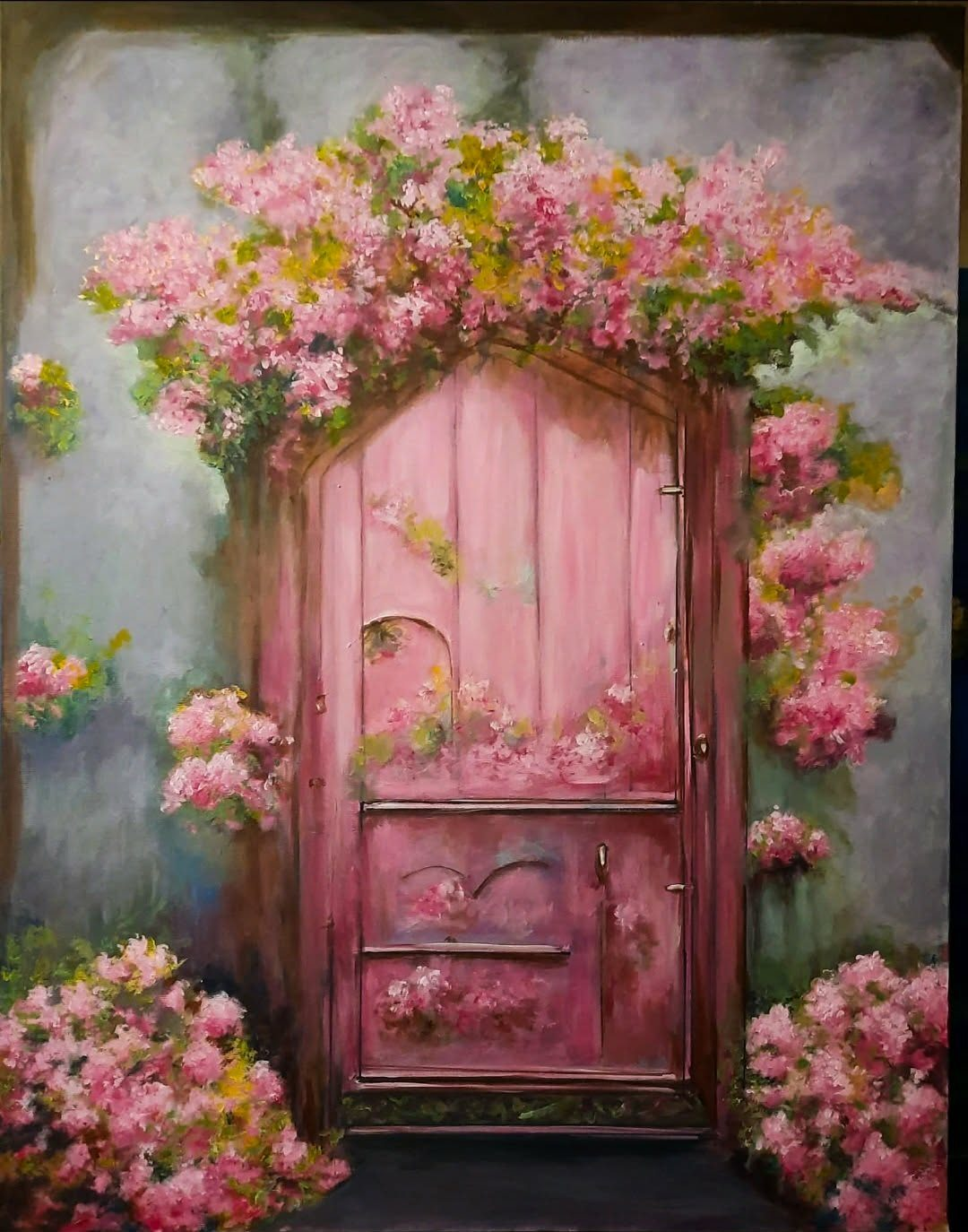 Elementi ricorrenti come i fiori, le scale, le porte e gli alberi, popolano il suo immaginario, assumendo valenze semiotiche profonde. Le rose, con il loro dualismo di bellezza spinosa, alludono alla complessità delle emozioni umane e alla figura della donna. La scala, che si snoda verso un cielo luminoso, è un’evidente allegoria del percorso spirituale, un’ascesa verso la conoscenza, verso una dimensione ultraterrena, un passaggio, così come la porta circondata dalla vegetazione fiorita, una soglia tra mondi, tra ciò che conosciamo e l’ignoto. Tra l’oggi e l’incognita del domani.