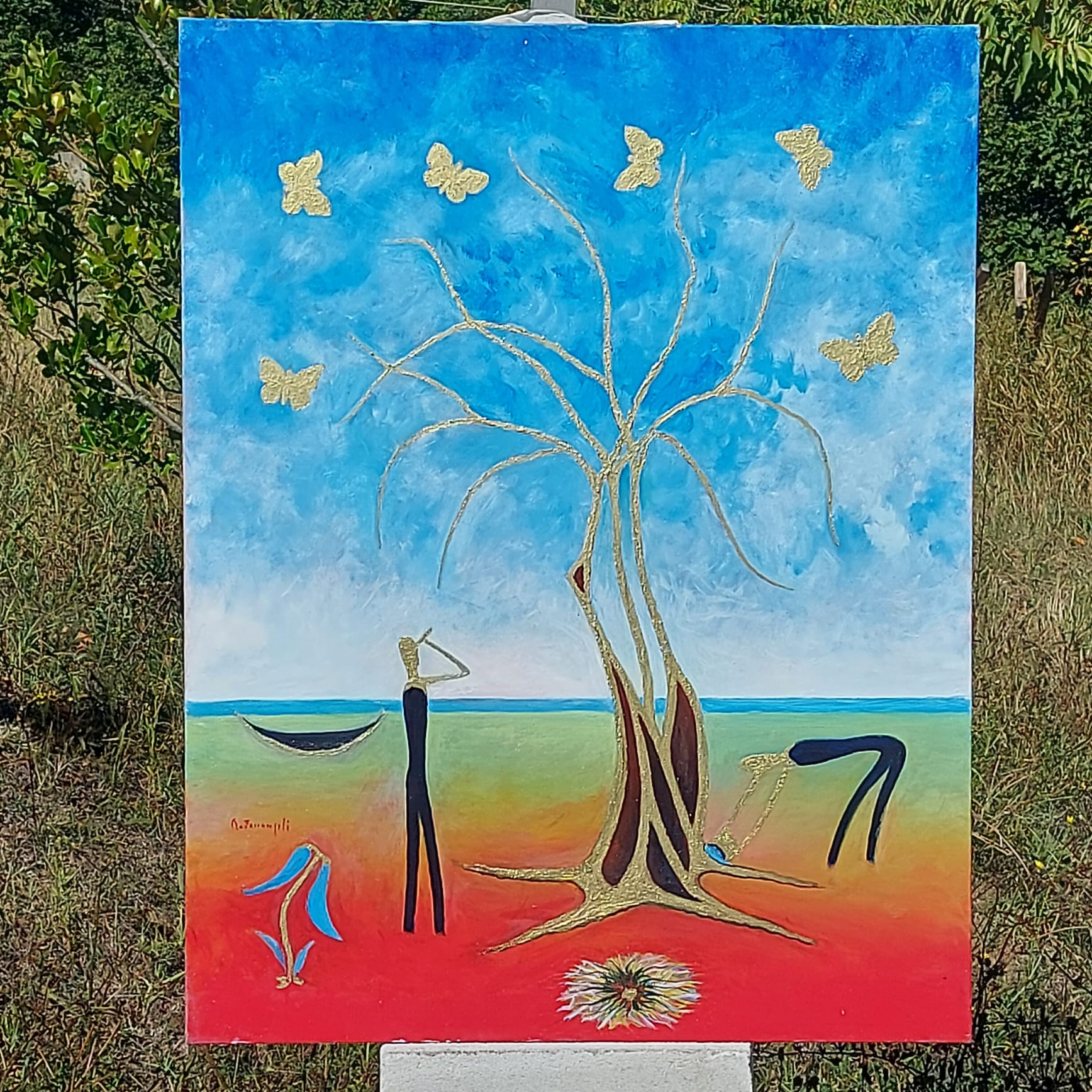 La semiotica di Zanangeli è popolata da farfalle dorate, presenze costanti che punteggiano il cielo, messaggere di una metamorfosi perenne, simboli di un’anima che ha trovato la libertà di volare oltre le contingenze del piano orizzontale.