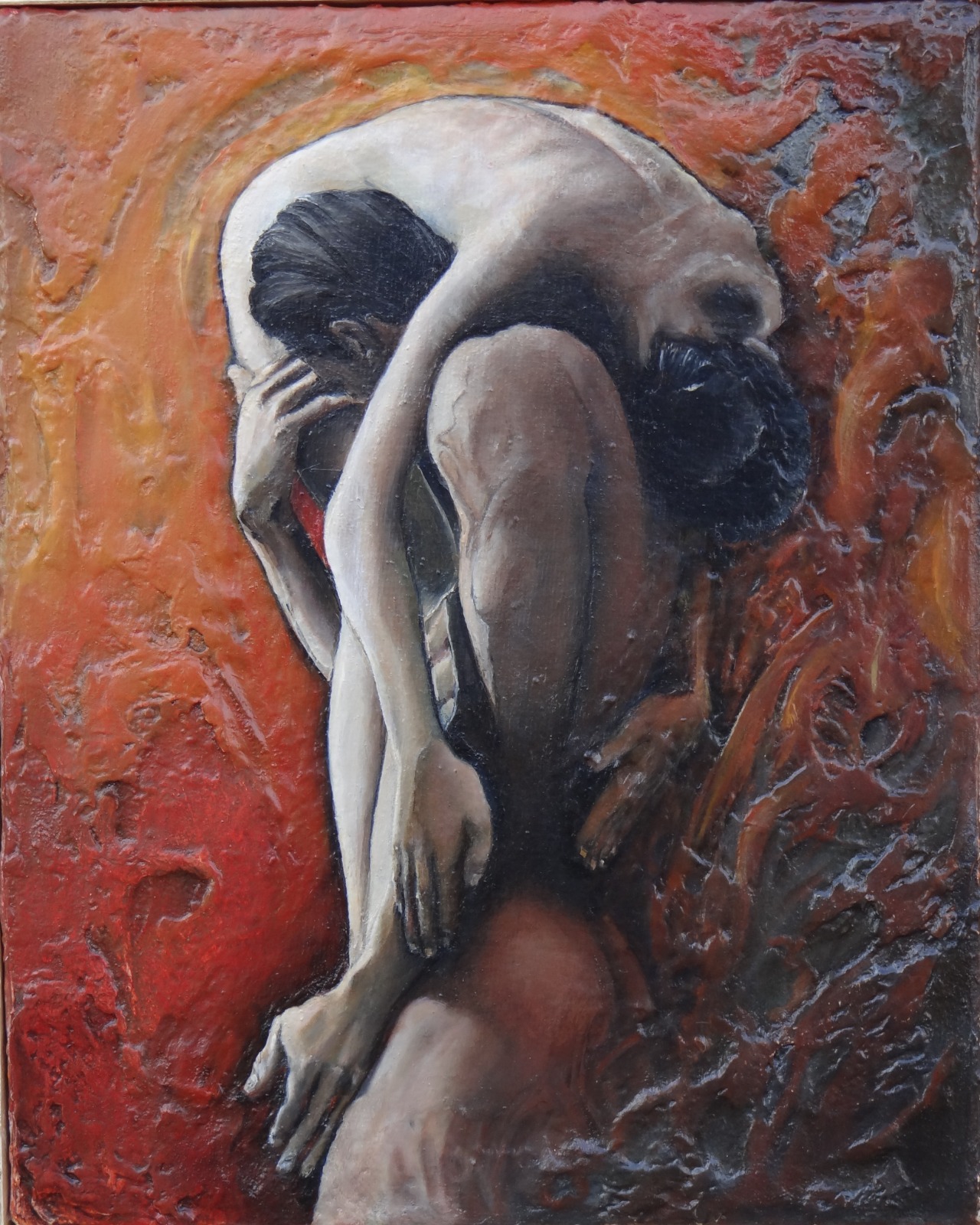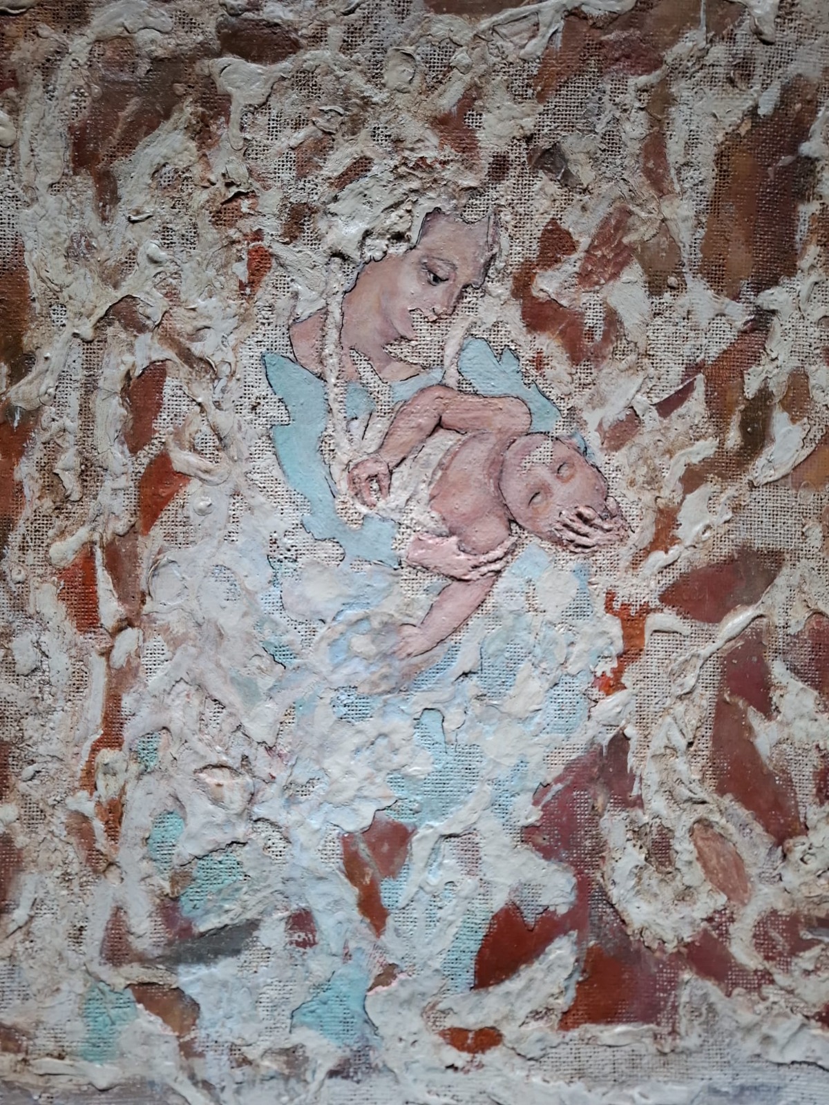 Nei suoi lavori, la figura umana, spesso declinata nel tema universale della maternità o dell’abbraccio viscerale, non è mai isolata, ma la emerge da una tempesta materica, da impasti densi che sembrano evocare le pareti di una caverna primordiale o i frammenti di un affresco dimenticato dal tempo, peculiarità stilistica dell’artista che si espleta nella rara capacità di coniugare la delicatezza quasi eterea dei volti e degli sguardi con la potenza tattile del supporto.