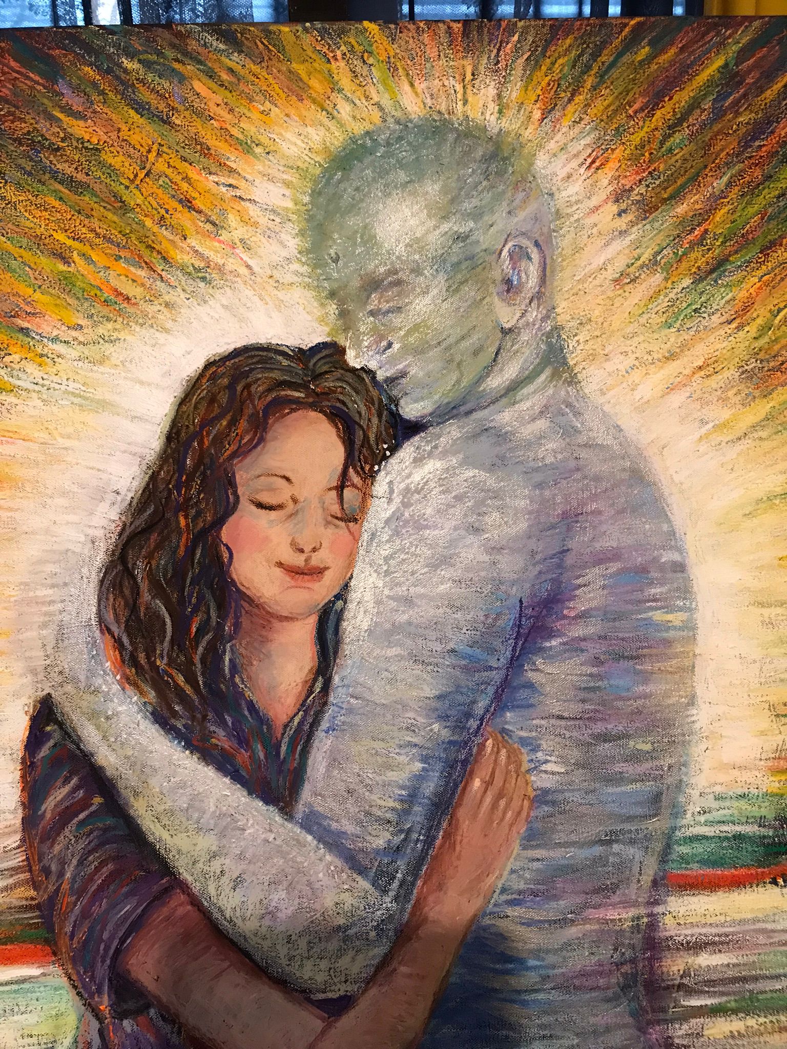 L’abbraccio con una figura eterea, quasi di pura luce e memoria, non è la rappresentazione di un lutto o di un incontro, ma la capacità di trovare conforto in ciò che non ha più corpo, nell’essenza che permane oltre la forma.