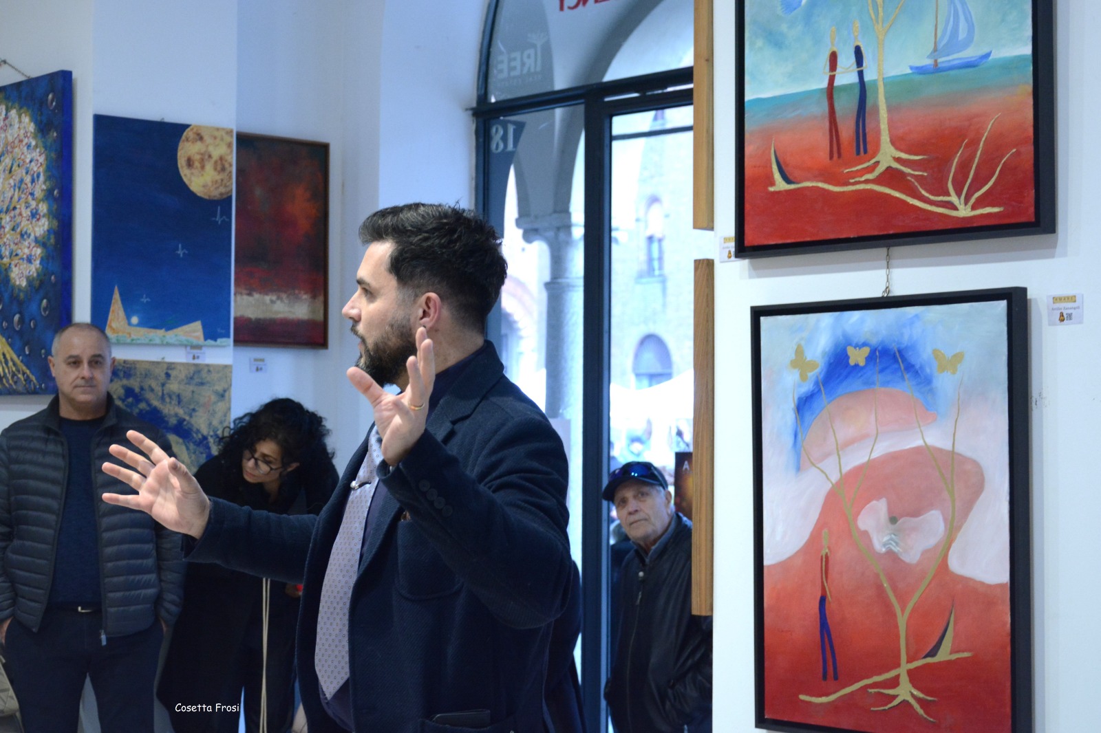 La tavolozza emotiva dell’artista spazia dai toni caldi e passionali dei rossi e degli aranci a quelli più introspettivi e spirituali dei blu e dei turchesi, in un dialogo cromatico che sfrutta la grammatica delle emozioni.