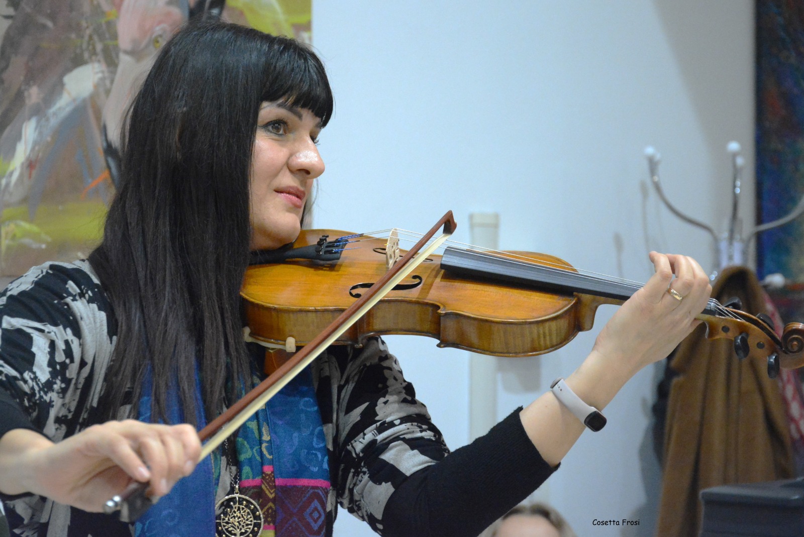 L’albero della vita, con le sue radici solide e la chioma rigogliosa, rappresenta il radicamento e l’espansione, mentre il violino è l’anima che osserva e vive il mondo.